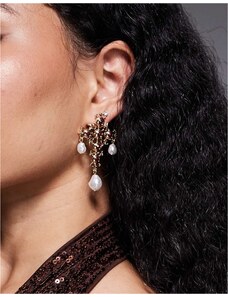 ASOS DESIGN gem embellished cross earrings with faux pearls in gold tone