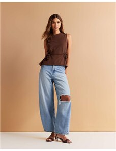 ASOS DESIGN high waisted barrel leg jeans with rips in mid blue