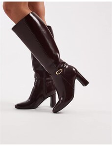 New Look faux leather block knee high heeled boots in burgundy-Red