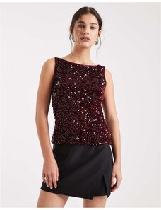 Pieces slash neck sequin top in burgundy-Red