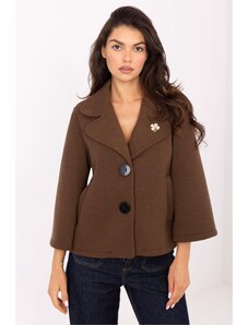 RUE PARIS Hnědý dámský krátký kabát s širokými rukávy a broží -brown Hnědá