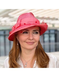 KRUMLOVANKA Dámský slavnostní klobouk se závojem - lososový - 100% Paglie -Fedora-C-096