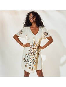 Blancheporte Krátké volánové šaty s etno potiskem indigo/režná