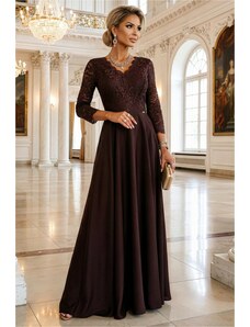 NUMOCO Elegantní čokoládově hnědé krajkové dlouhé šaty s výstřihem ELISA Hnědá
