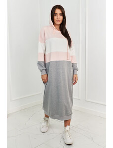 K-Fashion Trikolorní šaty s kapucí pudrově růžová + ecru + šedá