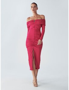 Trendyol Fuchsia tělo obepínající očko detailní štěrbinový čtvercový límec midi tkané šaty