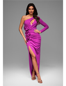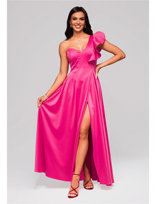 Numoco basic 580-5 AURORA Long Satin One Shoulder Dress with Rose and Slit | Pink