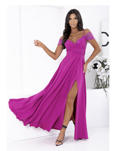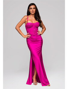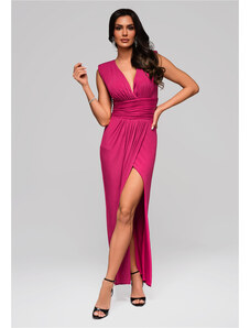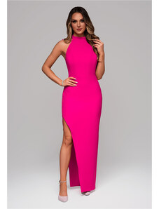 NUMOCO Fuchsiové dlouhé šaty s výstřihem a třpytkami CRYSTAL Fuchsiová