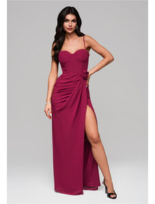 NUMOCO Tmavě růžové dlouhé saténové šaty s růžemi AURORA Tmavě růžová