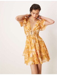 ASOS DESIGN mini dress with ruched bodice and ruffle tendrils in ochre floral-Multi