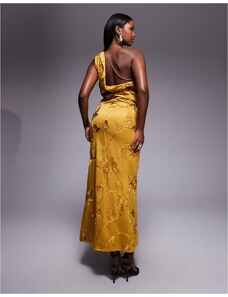 ASOS DESIGN embroidered one shoulder tuck drape midaxi dress in ochre-Yellow