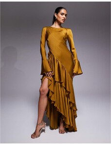 ASOS DESIGN long sleeve ruffle maxi dress with open back in mustard-Yellow