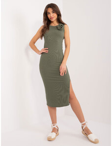 ITALY MODA Khaki midi šaty s květinou a rozparkem -khaki