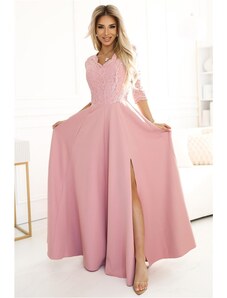 NUMOCO 309-13 AMBER Elegantní dlouhé krajkové šaty s výstřihem pudrová ružová