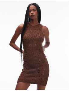Topshop knitted premium crochet mini dress in chocolate-Brown