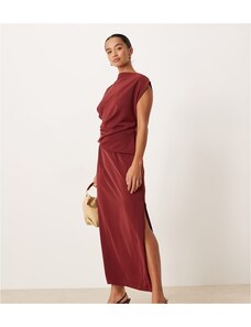 ASOS Petite ASOS DESIGN Petite high neck drapey pleated midi dress in burgundy-Red