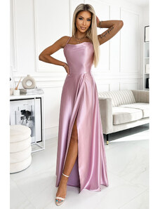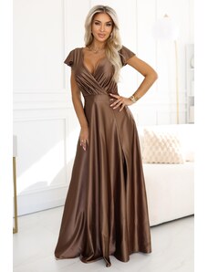 Numoco CRYSTAL saténové dlouhé šaty s výstřihem - mocha mousse 411-14