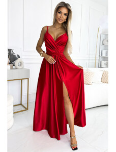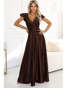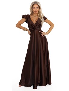 Numoco CRYSTAL saténové dlouhé šaty s výstřihem - čokoládové 411-15