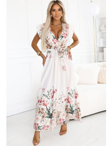 NUMOCO Smetanové saténové maxi šaty s hlubokým výstřihem a květinovým vzorem Smetanová