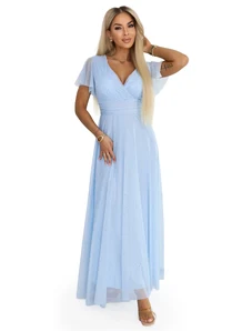 Numoco CRYSTAL třpytivé dlouhé šaty s výstřihem - světle modré se třpytkami 411-13