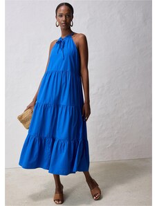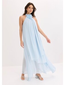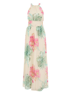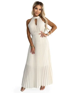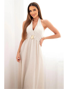 K-Fashion Dámské maxi šaty z viskózy vázané u krku s ozdobnou sponou béžová