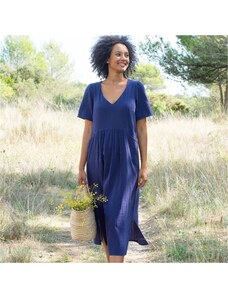 Blancheporte Mušelínové rozšířené midi šaty s výstřihem do V indigo