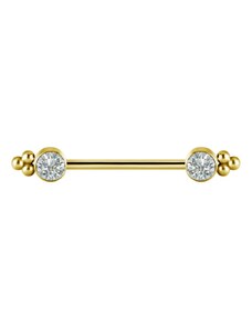 Šperk je vyroben z titanu nejvyšší implantační třídy - Titanium Ti6Al4V-ELI (ASTM F 136) a je osazený dvěma čirými prémiovými zirkony a 18 kt zlatým PVD pokovením.