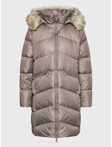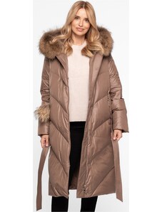 Perso Hnědý dámský prošívaný péřový kabát s bambulkou na kapsy Hnědá
