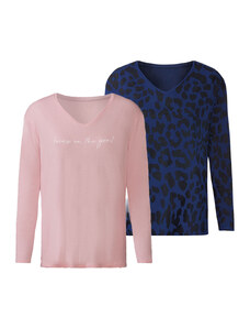 esmara Dámské triko s dlouhými rukávy; 2 kusy Vlákna přírodního původu Obzvlášť měkké a přiléhavé Viskóza šetřící zdroje 1 x s potiskem Ležérně střižené 2 kusy Modrá/růžová varianta Výstřih do V Přestřižené rukávy Šedá/růžová varianta Kulatý výstřih Přestřižená ramena Dope Dyed – nižší spotřeba vody při výrobě a dlouhotrvající jasnost barev Barva zůstane zachovaná i po vícenásobném vyprání Proces barvení Dope-Dyed Probíhá během spřádání vláken. Vlákna se kompletně probarvují směsí pigmentového barviva a roztoku spřádacího procesu tak, že se potom může příze bez dalšího barvení dále zpracovávat. Materiál 100 % viskóza Lenzing Ecovero Velikost XS 32/34 - L 44/46