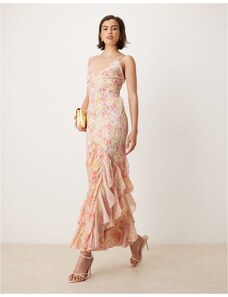 For Love & Lemons Elea ruffle maxi dress with lace up back in peach floral-Pink