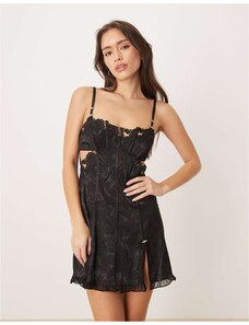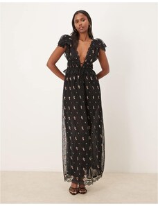 For Love & Lemons Poppy lace plunge neck tie detail embroidered maxi dress in black floral-Brown