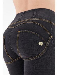 Freddy kalhoty WR.UP v džínové černé, žlutý šev, vysoký pas, skinny střih, denim žerzej