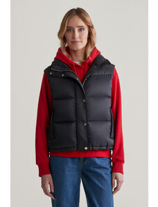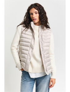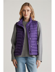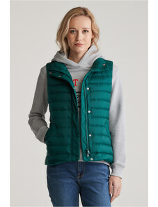 Prošívaná péřová vesta odlehčené gramáže, jejíž povrchový materiál a podšívka jsou tvořeny 100 % recyklovaným syntetickým vláknem. Rovný střih s praktickým stojáčkem u krku doplňuje zapínání na dvoucestný zip překryté légou s lakovanými druky. Nechybí boční kapsy se zapínáním, vnitřní kapsička se zipem a tonální potisk loga Gant umístěný na hrudi. Materiálové složení s kvalitní výplní z kachního peří v poměru 90/10 zaručuje dokonalou hřejivost, prodyšnost a příjemný pocit při nošení. Velmi praktický a komfortní kousek, který díky svojí lehkosti využijete celoročně jako stylovou vnější i hřejivou spodní vrstvu.