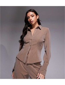 Kaiia exclusive button front fitted shirt co-ord in beige pinstripe-Neutral