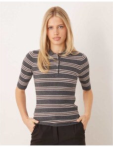 Mango short sleeve knitted polo top in grey stripe