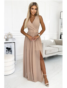 NUMOCO Dlouhé tmavě béžové společenské šaty s výstřihem GERDA Béžová