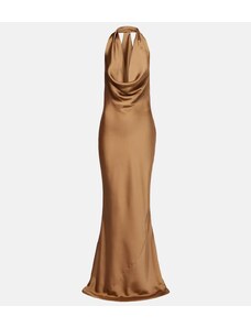 Numoco CRYSTAL saténové dlouhé šaty s výstřihem - mocha mousse 411-14