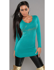 Svetr Koucla pulovr - tunika se zlatým nápisem z kamínků petrolejová modrá Koucla MI0162b
