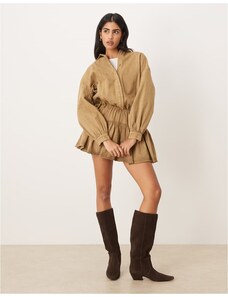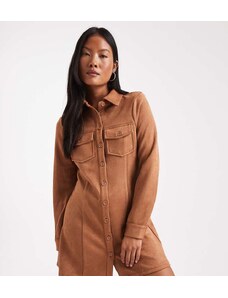Miss Selfridge Petite long sleeve suedette dress in tan-Brown