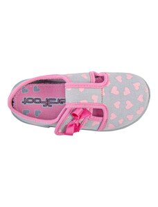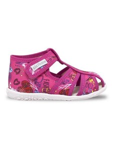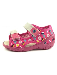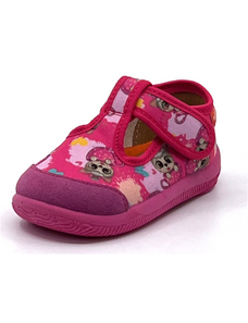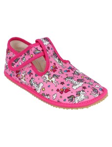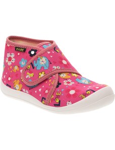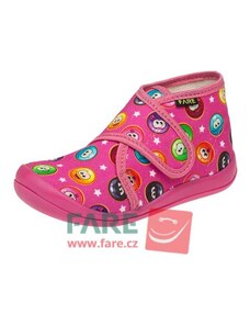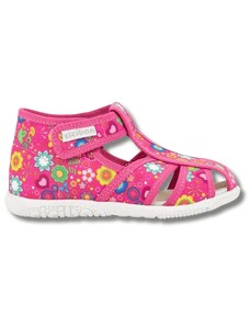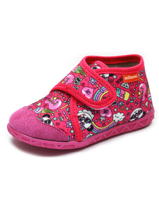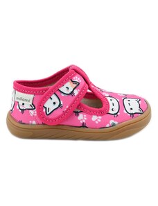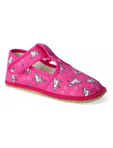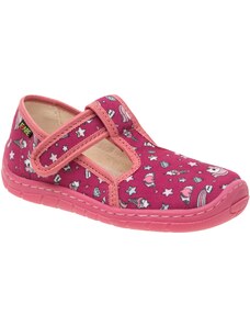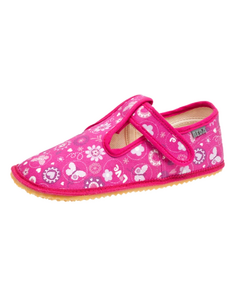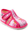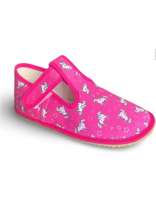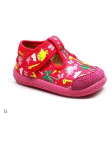 Dětské bačkůrky, sandálkového střihu s uzavřenou špicí se zapínáním na "suchý zip. Tvar špičky s důrazem na typicky dětský dominantní paleček zajišťuje dostatečný prostor pro prsty. Bačkůrka je lehká, pružná vyrobena z textilu (ze 100% bavlny), který zajišťuje prodyšnost a dokonalou přispůsobilost tvaru nohy. Stélka bačkůrky je v části klenku vyplněna pěnovým materiálem, což zabezpečuje dítěti pohodlnou chůzi a podporuje zdravý vývoj nohy. Obuv je určena do interiéru jako přezůvková obuv. Je zdravotně a hygienicky nezávadná. Obuv se jako nová může na hladkých površích klouzat (keramická dlažba, laminátová podlaha...) Na takové povrchy je vhodnější obuv z naší nabídky pod označením inovativní a flexi bačkůrky. V rámci licenčního oprávnění k používání ochranné známky Žirafa a Česká kvalita byla posuzována komisí odborníků a dětského ortopeda. Při koupi této obuvi si můžete být jisti, že jste pro pohodlí, bezpečnost a zdravý vývoj nožky Vašeho děťátka udělali správný krok.