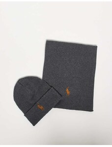 Polo Ralph Lauren icon logo cotton knit beanie & scarf set in dark grey marl