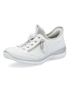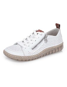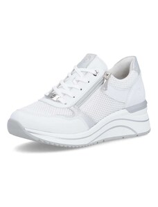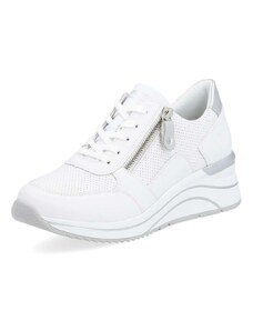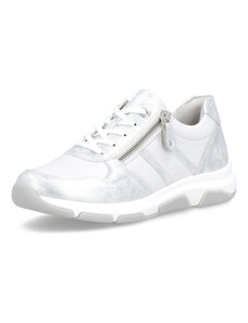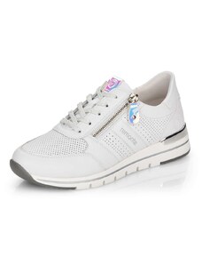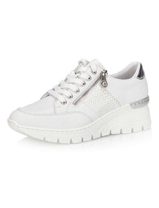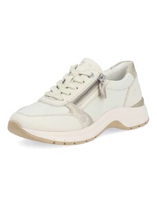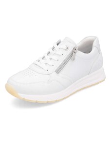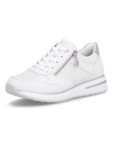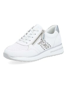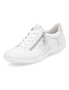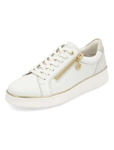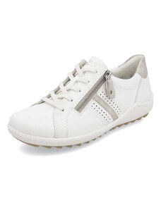 Obuv REMONTE – jedná se o vyšší řadu značky RIEKER, tato obuv se vyznačuje vynikající kombinací svrchních materiálů. Rádi byste obuv, ve které vám bude pohodlně v každé situaci a která doplní váš šatník nadčasovým vzhledem? Tyto tenisky splní Vaše přání. Jejich kožený svršek bílé barvy je doplněn zipem pro urychlení obutí a šněrováním pro dokonalou úpravu tvaru nohy. Nápaditým prvkem je lesklý materiál uchycení zipu, který vytváří nádherné odlesky. Vyjímatelná měkká stélka Vám zajišťuje příjemnou chůzi po celý den nošení a proto jsou to ideálním doplňkem pro Vaše volnočasové aktivity. Nejenže budou pohodlné, ale také Vám dodají potřebnou jistotu a styl.