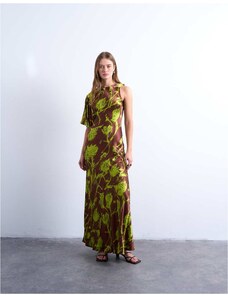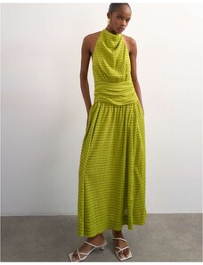 Topshop dropped waist halter maxi dress in brown and lime check-Green