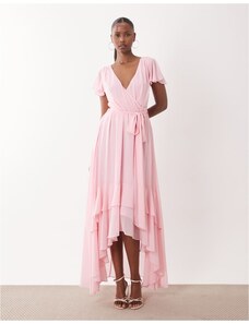 TFNC Bridesmaid chiffon v neck tie detail asymmetric hem maxi dress in baby pink