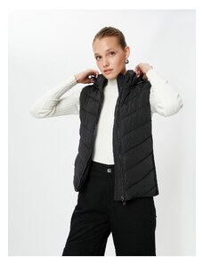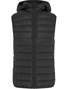 Tato vesta je černé barvy, zateplená a prošívaná, vyrobena z lehkého, ale teplého materiálu. Má kapuci a zapínání na zip po celé délce, což poskytuje dobrou ochranu před větrem a chladnějším počasím. Prošívání je vodorovné a rovnoměrně rozdělené, což přispívá k modernímu a čistému vzhledu. Vesta je ideální pro vrstvení přes trička nebo mikiny během chladnějších dnů, kdy je potřeba větší volnost pohybu.