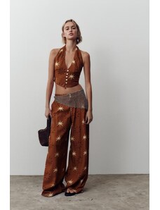 ZARA ŠIROKÉ KALHOTY S POTISKEM SLUNÍČEK Z LNU Terakota XS