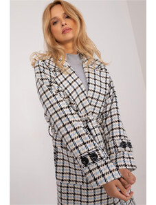 MladaModa Dlouhý dvouřadý károvaný kabát s páskem model 55867 světle modrý